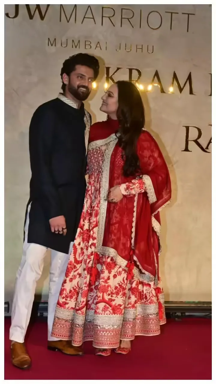 Bollywood actress Sonakshi Sinha looked stunning in a red printed floor-length Anarkali, featuring an intricate zari border at the hem, with her dupatta elegantly draped to one side. Zaheer complemented her perfectly, looking dashing in a navy-blue bandhgala paired with white trousers. Fans quickly noticed Sonakshi’s pregnancy, as she subtly tried to cover her baby bump while posing for the cameras.