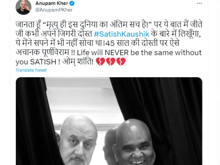 Anupam Kher wrote, “I know ‘death is the ultimate truth of this world!’ But I never thought in my dreams that I would write this thing about my best friend #SatishKaushik while alive.” He added that it is a heartbreaking ending to a friendship of 45 years. The heartbroken Anupam said that life will be difficult without his friend. He concluded with “Om Shanti!”
