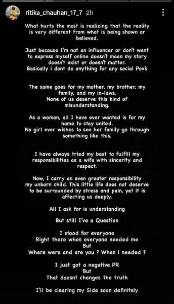 These allegations quickly went viral, sparking intense discussion across social media. Ritika has now shared a series of Instagram Stories, revealing that the reality is completely different from what has been portrayed. She emphasized that just because she is not an influencer or does not publicly discuss her personal life, it does not mean she doesn’t have a side to the story. She defended both her own family and her in-laws, stating that they do not deserve the negativity and misconceptions being spread online.