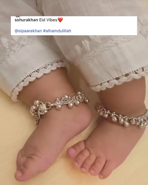 Captioned simply as “Eid vibes,” the post beautifully reflected the festive spirit. Although Sshura has chosen not to reveal Sipaara’s face yet, the glimpse was enough to melt hearts online. In the photo, little Sipaara appeared dressed in a traditional kurta-pajama, perfectly styled for the occasion. The delicate anklets, decorated with tiny bells, added a cultural and festive touch, hinting at a thoughtfully planned Eid outfit.