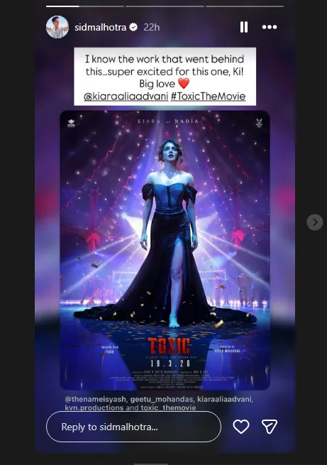 Sidharth Malhotra recently expressed his admiration for wife Kiara Advani after the makers unveiled her first look from the much-anticipated film Toxic: A Fairytale for Grown-Ups. Taking to social media, the actor praised the effort behind the project and shared his excitement, leaving fans swooning over the couple’s public display of support.