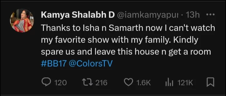 “Thanks to Isha n Samarth now I can’t watch my favorite show with my family. Kindly spare us and leave this house n get a room”, tweets Kamya Punjabi.