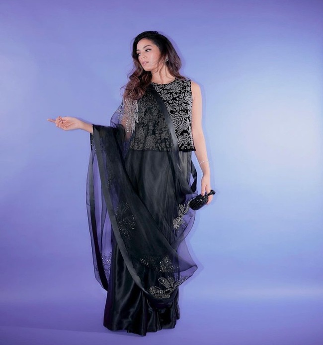 Combined with the sheer saree, this ulta-pallu and cropped black top is a wonderful modern twist on the traditional saree. Mira Rajput looks stunning in this saree.