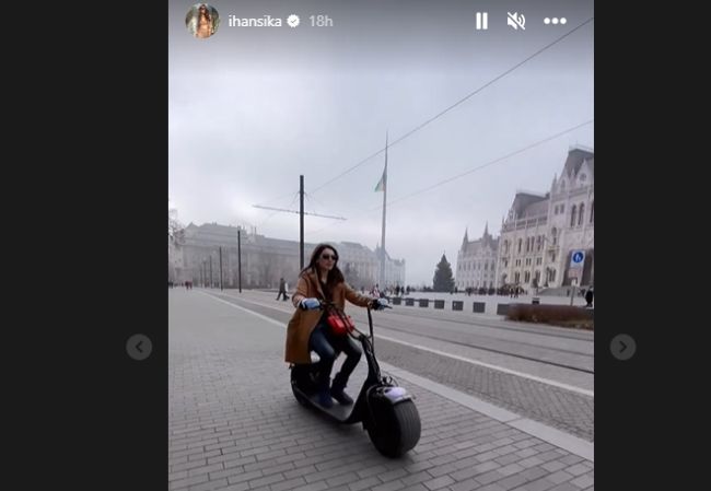 Actor Hansika Motwani and her husband Sohael Kathuriya are in Europe for their honeymoon. They shared pictures and videos from their Christmas celebrations in Vienna on Instagram Stories. She shared a snap of their trip to Budapest. On Monday, the actor took to Instagram Stories to share a video of herself. She rode an e-scooter in the Hungarian capital.