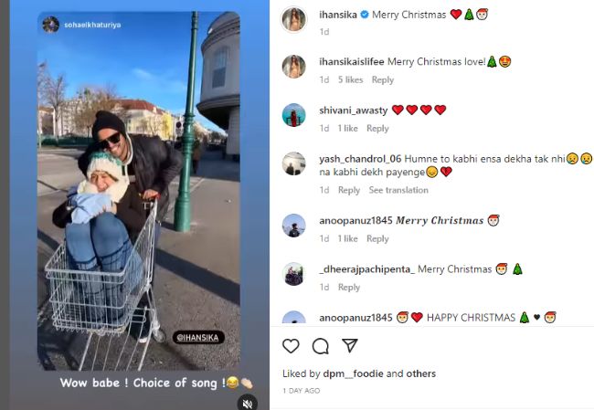 Recently, she shared many pictures and videos of her Christmas celebrations in Vienna with Sohael. In one photo, Hansika was seen posing with Santa Claus. She made a funny face. She shared a lighted Christmas tree in the middle of a busy street. She shared more pictures from her Christmassy honeymoon with Sohael. The actor re-shared her Instagram stories from their outing during the day too.