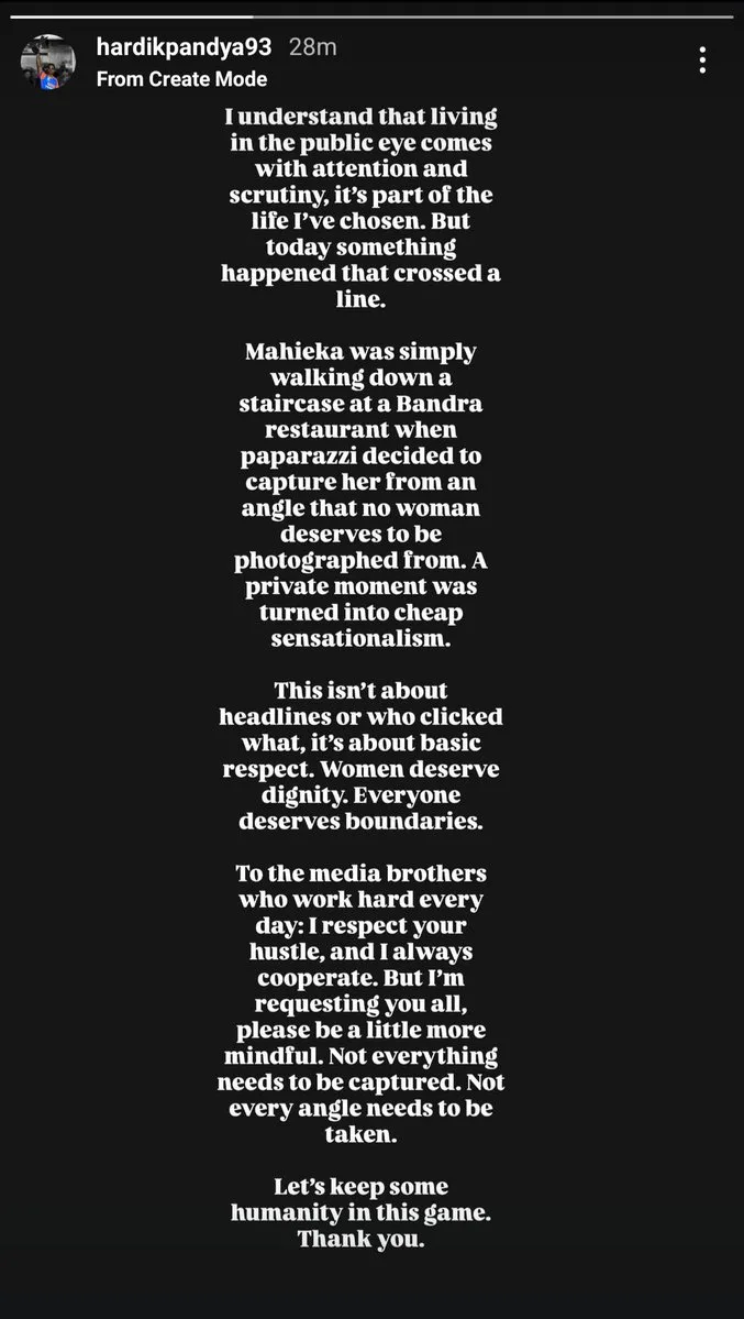 Pandya addressed the matter on his Instagram story. He acknowledged that living in the public eye invites scrutiny: “It’s part of the life I’ve chosen,” he said. But in this instance, “something happened that crossed a line.” The cricketer called the footage “cheap sensationalism,” condemning the intrusion into what should have been a private moment. He stressed it wasn’t about headlines or publicity, “it’s about basic respect.” Pandya appealed to the media: “Women deserve dignity. Everyone deserves boundaries.” He asked paparazzi to show more sensitivity and empathy rather than capturing “every angle.”