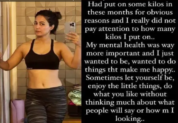Sharing a note on her Instagram stories along with a picture of herself in black gym wear, Hina penned, “I had put on some kilos in these months for obvious reasons and I really did not pay attention to how many kilos I put on… My mental health was way more important and I just wanted to be, wanted to do things that make me happy.”