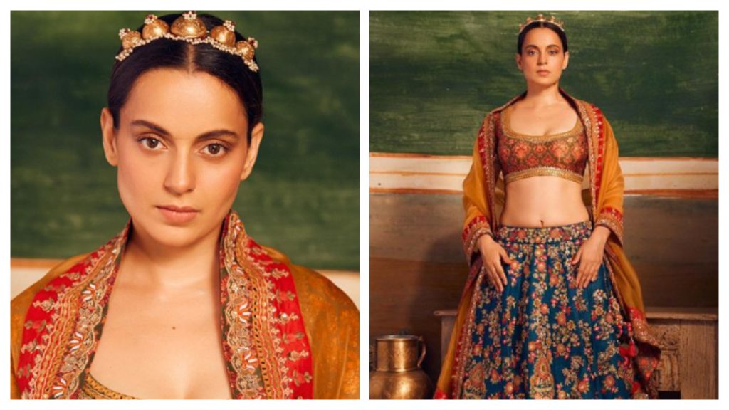 Bollywood actress Kangana Ranaut recently shared a series of photos of herself on her Instagram. She looks no less than a queen and ethnicity was the theme. The actress wore a blue and red lehenga along with a rust and olive green blouse. She took a matching rust dupatta as well. Kangana paired her royal ethnic look with a pearl and gold headpiece. She posed for a stunning photoshoot exuding regal vibes.