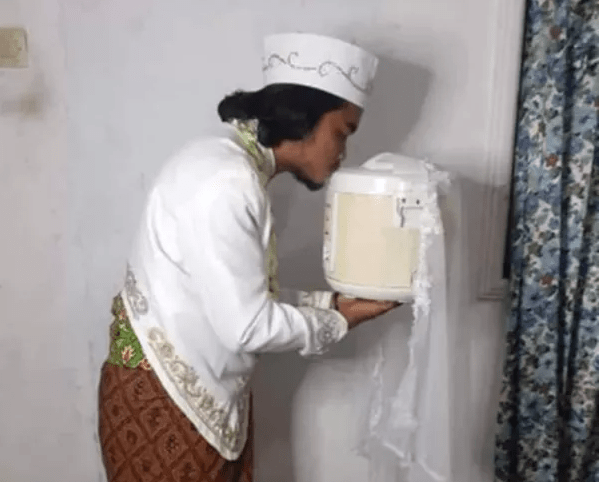 Photos of an Indonesian man marrying his beloved rice cooker have gone viral on Twitter. The man is seen dressed in white wedding attire while the bride wore just a wedding veil – well, she’s a rice cooker. Yes, the electric appliance used to make rice for everyday meals. The man in the picture is Khoirul Anam who posted the pictures on his Facebook page to announce his marriage with the rice cooker on September 20.