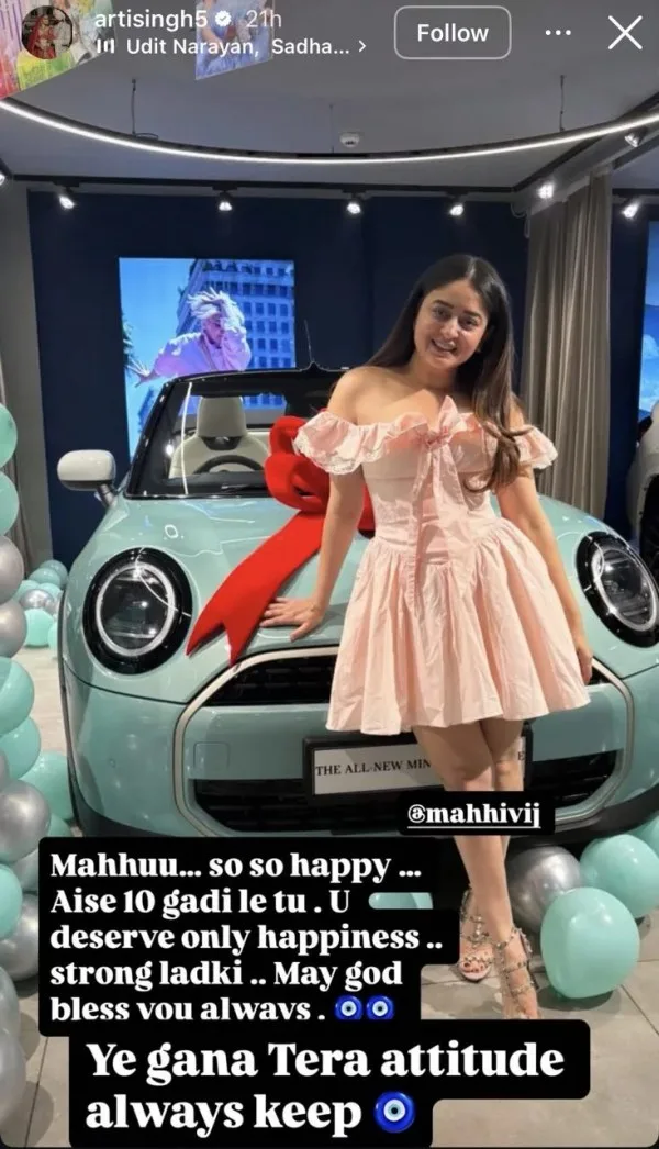 Although Mahhi Vij has not shared pictures of her new car on her own social media, her close friend Aarti Singh took to Instagram to celebrate the happy moment. Aarti shared a picture in which Mahhi is seen posing confidently in front of her new car. Dressed in a pink outfit, Mahhi looked radiant and strong, reflecting a fresh chapter in her life. Sharing the photo, Aarti penned a heartfelt note expressing love, pride, and encouragement for her friend.