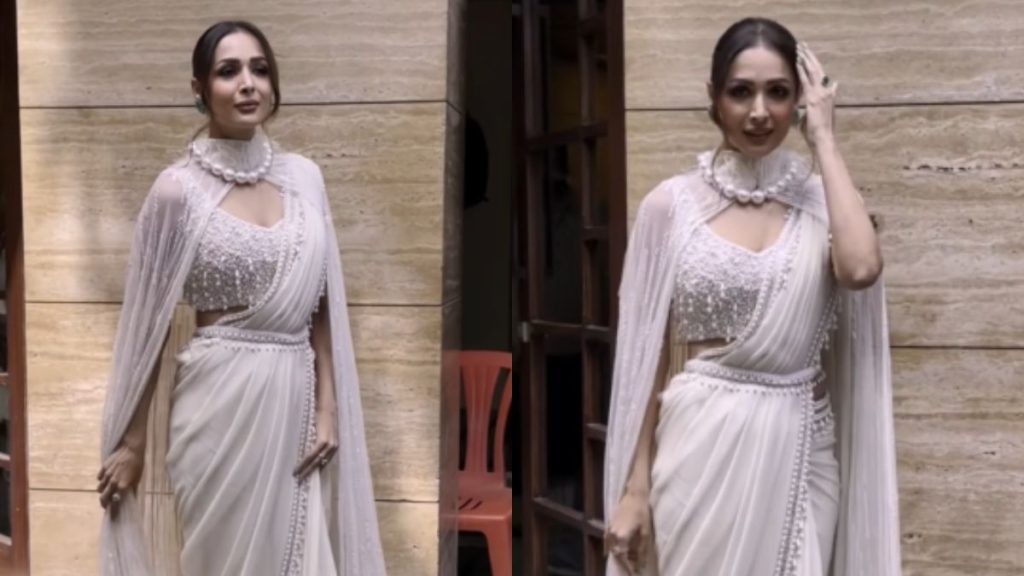 Bollywood diva Malaika Arora was spotted in Mumbai on Friday. She possibly attended an event or appeared on a TV show. She looked stunning in a cream saree. The actress wore a sequined blouse along with a long matching cape. Her hair was in a neat bun. She had a large pearl necklace. Her fans loved her look. They praised her on social media.