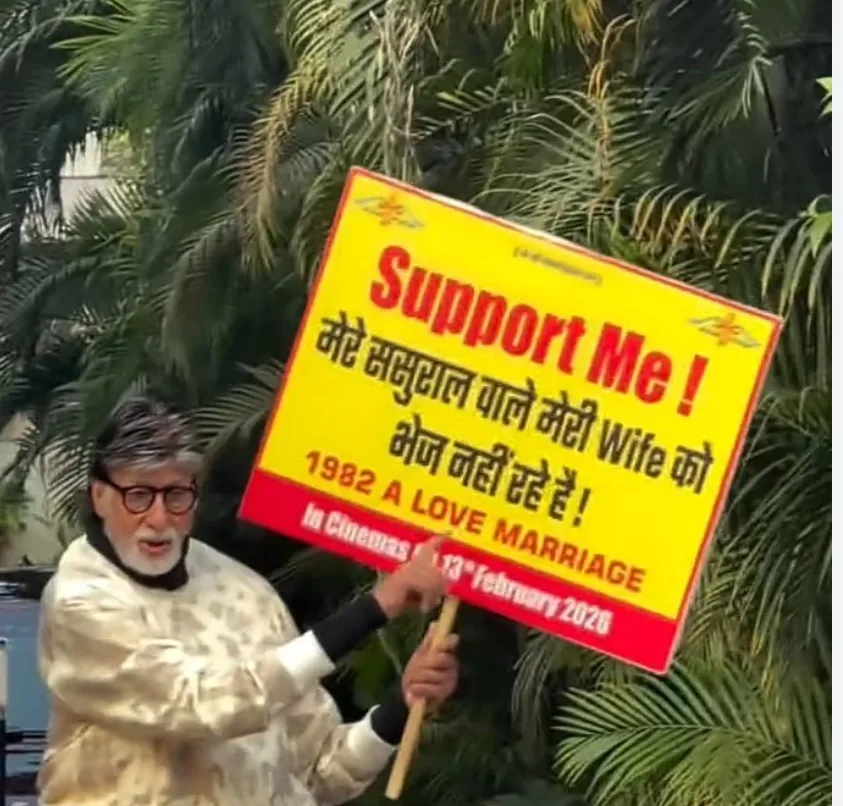 However, last Sunday, February 8, 2026, the superstar surprised everyone when he appeared holding a poster that quickly went viral on social media. As Amitabh Bachchan waved to fans and posed for pictures, he was seen holding a placard that read in bold letters, “Support me. My in-laws are not sending me my wife. 1982: A Love Marriage. In theatres on February 13, 2026.”