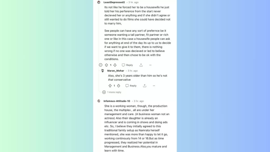 The comment section of Reddit was inundated with netizens the moment a user published a screenshot of the interview. Many were moved by the passionate speeches given by Mahesh Babu and Namrata Shirodkar just before they exchanged “yes” for marriage. He didn’t compel her to stay at home and raise their children, as one commenter pointed out. He was forthright about his preference from the beginning; he never lied to her or tried to trick her.