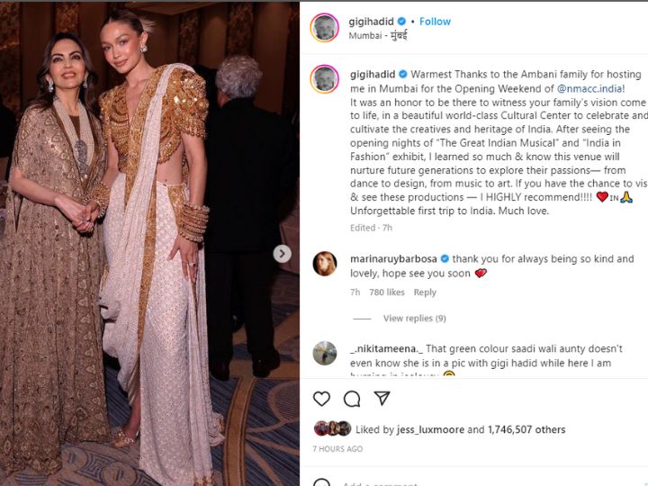 During the NMACC gala, the gorgeous Gigi made a brief appearance on stage. Bollywood actor Varun Dhawan invited her on stage, lifted her in his arms, and kissed her on the cheek. She shared a video of their performance. The model thanked Varun. She said that Varun made her Bollywood dream come true. She started following Varun on Instagram too.