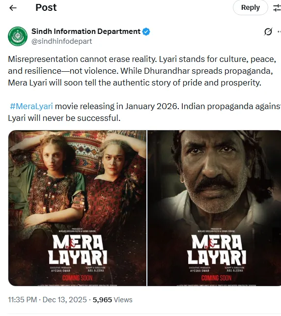 The Sindh government, responding to criticism that Dhurandhar portrays Lyari and Pakistan negatively, has unveiled a new project titled Mera Lyari. According to the provincial information department, the film will aim to present a more authentic and positive image of Lyari—highlighting its culture, community spirit, resilience and everyday life rather than focusing on crime or violence.