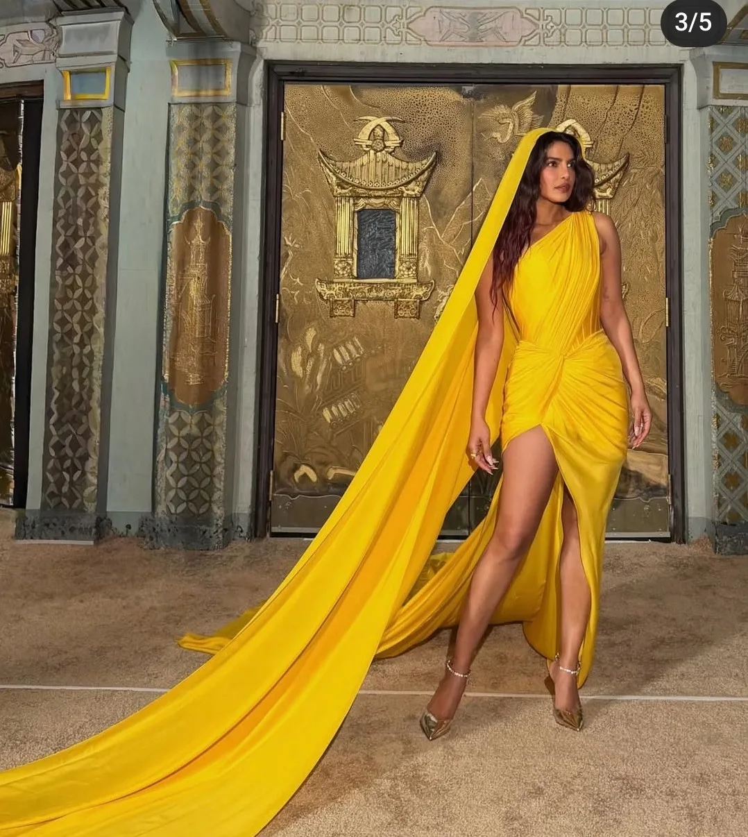 Priyanka Chopra turned heads at the after party of her upcoming project The Bluff, stepping out in a striking yellow creation by Indian designer Gaurav Gupta. The global star, known for blending Indian couture with international red carpet sensibilities, chose a saree gown that balanced tradition with sculptural drama, instantly becoming one of the most talked about fashion moments of the evening.
