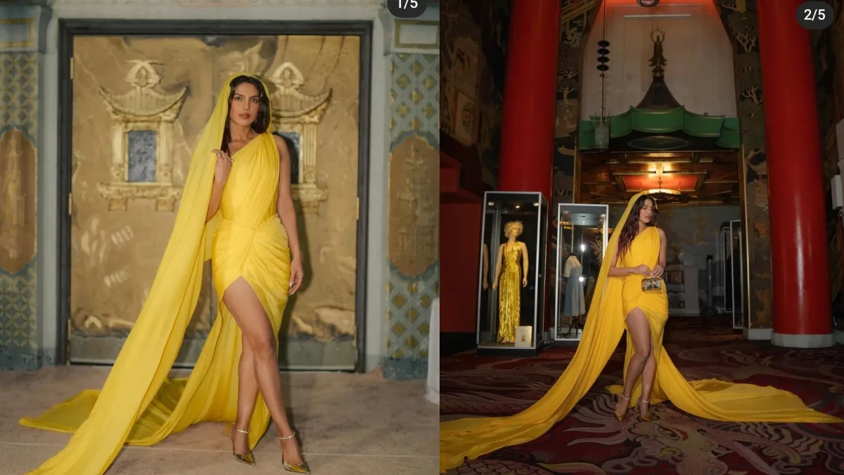 Priyanka Chopra turned heads at the after party of her upcoming project The Bluff, stepping out in a striking yellow creation by Indian designer Gaurav Gupta. The global star, known for blending Indian couture with international red carpet sensibilities, chose a saree gown that balanced tradition with sculptural drama, instantly becoming one of the most talked about fashion moments of the evening.