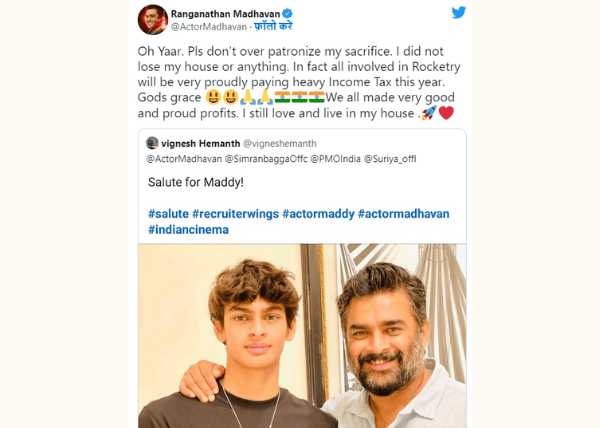 R Madhavan decided to respond to this tweet after seeing it. This is untrue, he said. Madhavan wrote “Oh Yaar. Pls don’t over patronize my sacrifice. I did not lose my house or anything. In fact all involved in Rocketry will be very proudly paying heavy Income Tax this year. Gods grace We all made very good and proud profits. I still love and live in my house.”