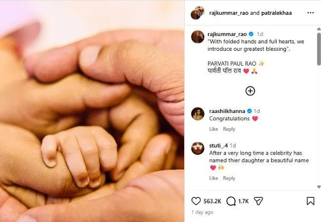Soon after the couple revealed their daughter’s name, several celebrities from the Hindi film industry flooded the comments section with congratulatory messages and heart emojis, celebrating the arrival of the newest star kid. Rajkummar Rao and Patralekhaa’s love story is considered one of the most genuine and beautiful in Bollywood. The two have known each other for over a decade.