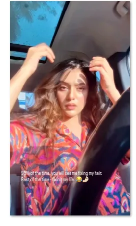 In a short video clip shared on her Instagram story, Mahvash is seen calmly fixing her hair inside a car. She captioned it wryly: