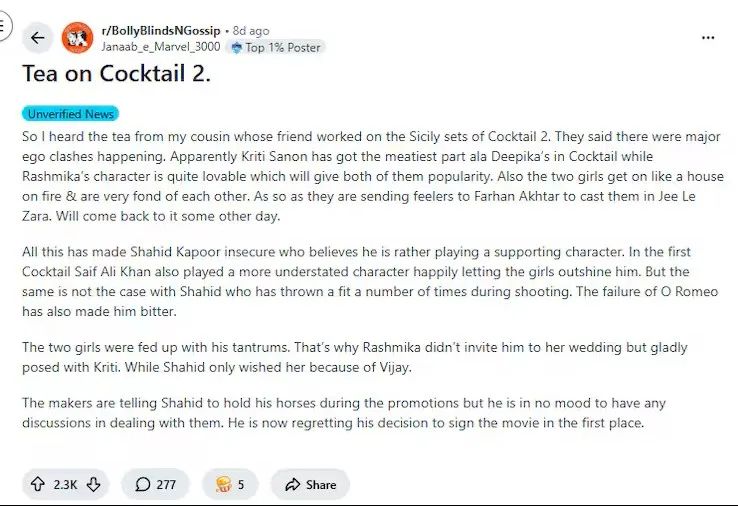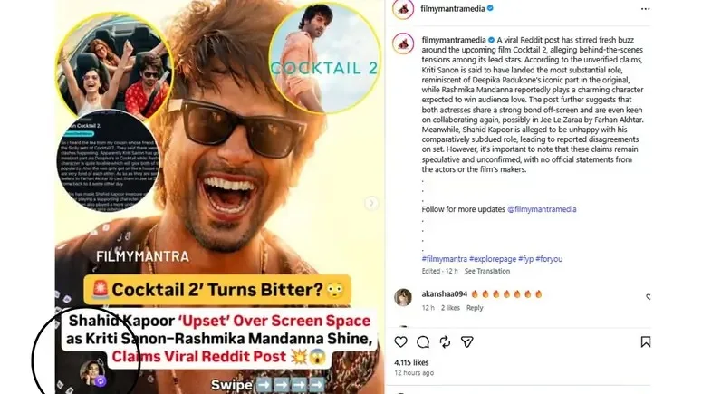 According to the viral post, Kriti Sanon is reportedly playing the most substantial role in Cocktail 2, similar to Deepika Padukone’s iconic character in the original 2012 film. Rashmika Mandanna is said to have a charming and audience-friendly role, while Shahid Kapoor’s part is allegedly more subdued. These claims suggested that Shahid might be unhappy with the narrative focus and screen-time imbalance, leading to online discussions about possible tension on the sets. However, there has been no official confirmation from Shahid Kapoor or the film’s makers, and the claims remain speculative.