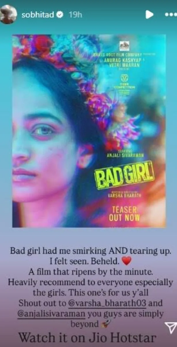 On 11 November 2025, Sobhita took to her Instagram Stories, sharing the film poster of Bad Girl and writing, “Bad Girl had me smirking AND tearing up. I feel seen. Beheld. (heart emoji) A film that ripens by the minute. Heavily recommend to everyone, especially the girls. This one’s for us, y’all. Shout out to @varsha.bharath3 and @anjalisivaraman you guys are simply beyond (confetti emoji). Watch it on Jio Hotstar.”