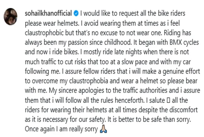 Amid the criticism, Sohail Khan had already addressed the issue through a detailed Instagram post. Interestingly, he himself shared a photo of riding a bike without a helmet and clarified the reason behind it. In his post, Sohail wrote, “I urge all bike riders to please wear a helmet. I sometimes avoid wearing a helmet because I suffer from claustrophobia, but this is no excuse for not wearing a helmet.”