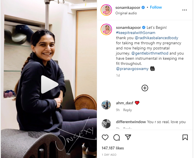 In the caption of this clip, Sonam penned, “Let’s Begin. #KeepitrealwithSonam Thank you Radhika Karle for taking me through my pregnancy and now helping my postnatal journey. Gentle Birth Method and you have been instrumental in keeping me fit throughout.”