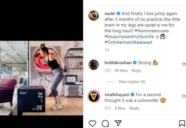 Interior designer Sussanne Khan took to her Instagram handle and shared a clip from her workout on Monday. In the clip, she is seen doing box jumps. Her agility and strength have impressed many fans, as well as her ex-husband and actor Hrithik Roshan, who praised her strength in the comments section.