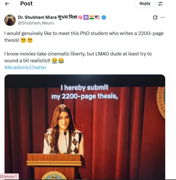 One comment widely shared on X joked, “I would genuinely like to meet this PhD student who writes a 2,200-page thesis! I know movies take cinematic liberty, but at least try to sound a bit realistic!”