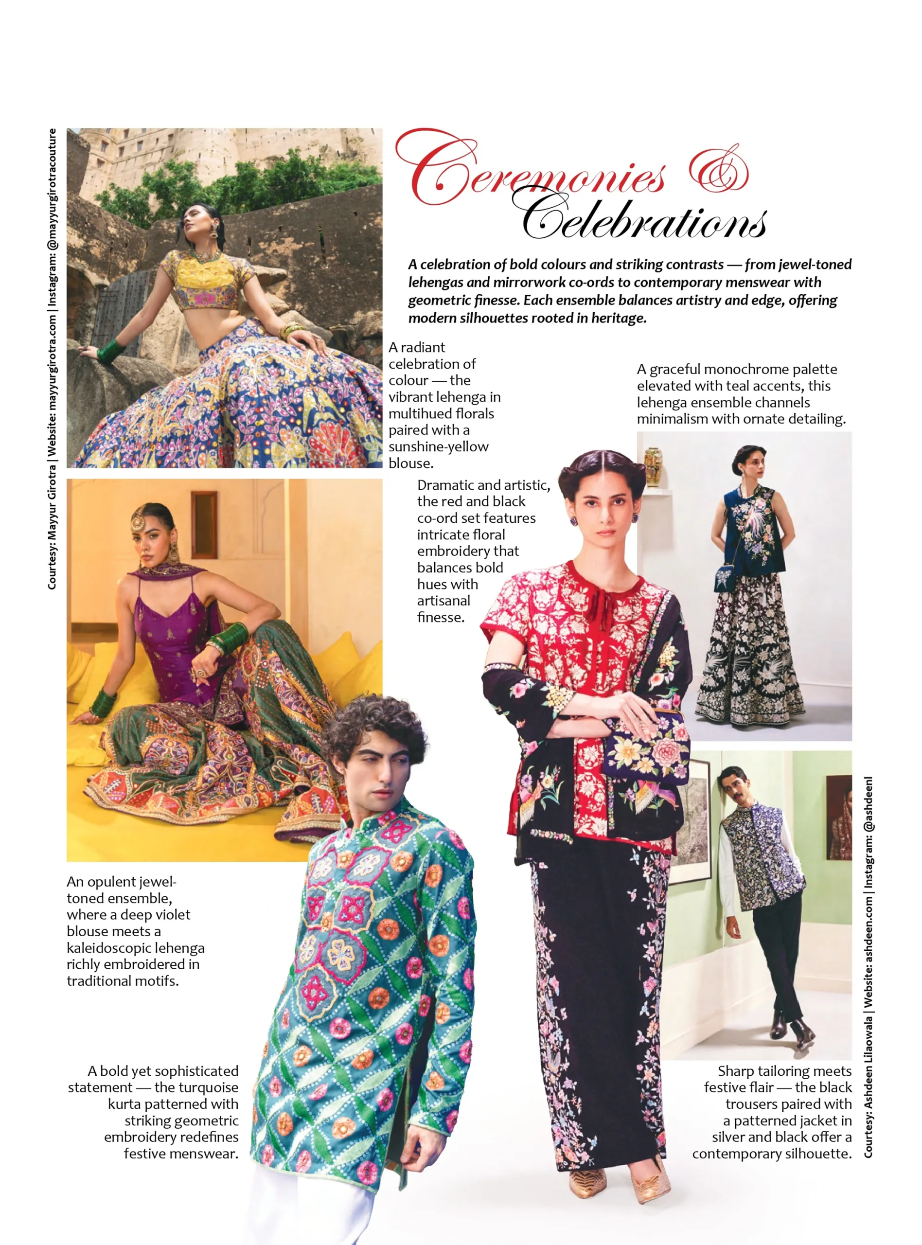 Celebrations of bold colours and striking contrasts — from jewel-toned lehengas and mirrorwork co-ords to contemporary menswear with geometric finesse. Each ensemble balances artistry and edge, offering modern silhouettes rooted in heritage. These looks honour tradition while refreshing it with vibrant palettes and statement-making details, perfect for both the radiant bride and the elegantly dressed guest.