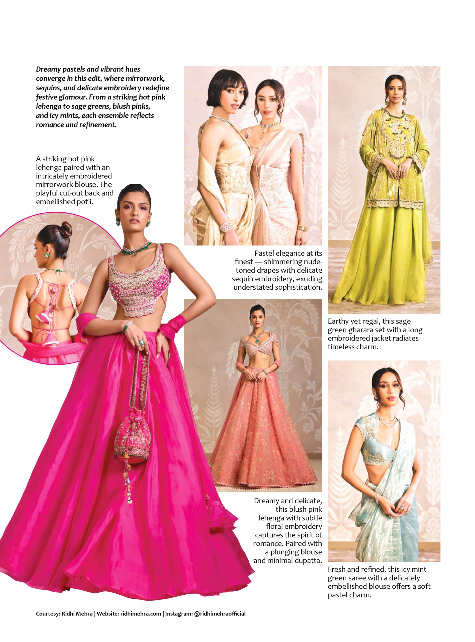 Dreamy pastels and vibrant hues converge in this edit, where mirrorwork, sequins, and delicate embroidery redefine festive glamour. From a striking hot pink lehenga to sage greens, blush pinks, and icy mints, each ensemble reflects romance and refinement. These creations celebrate feminine grace while lending effortless charm to bridesmaids, wedding guests, and every role in the season’s festivities.
