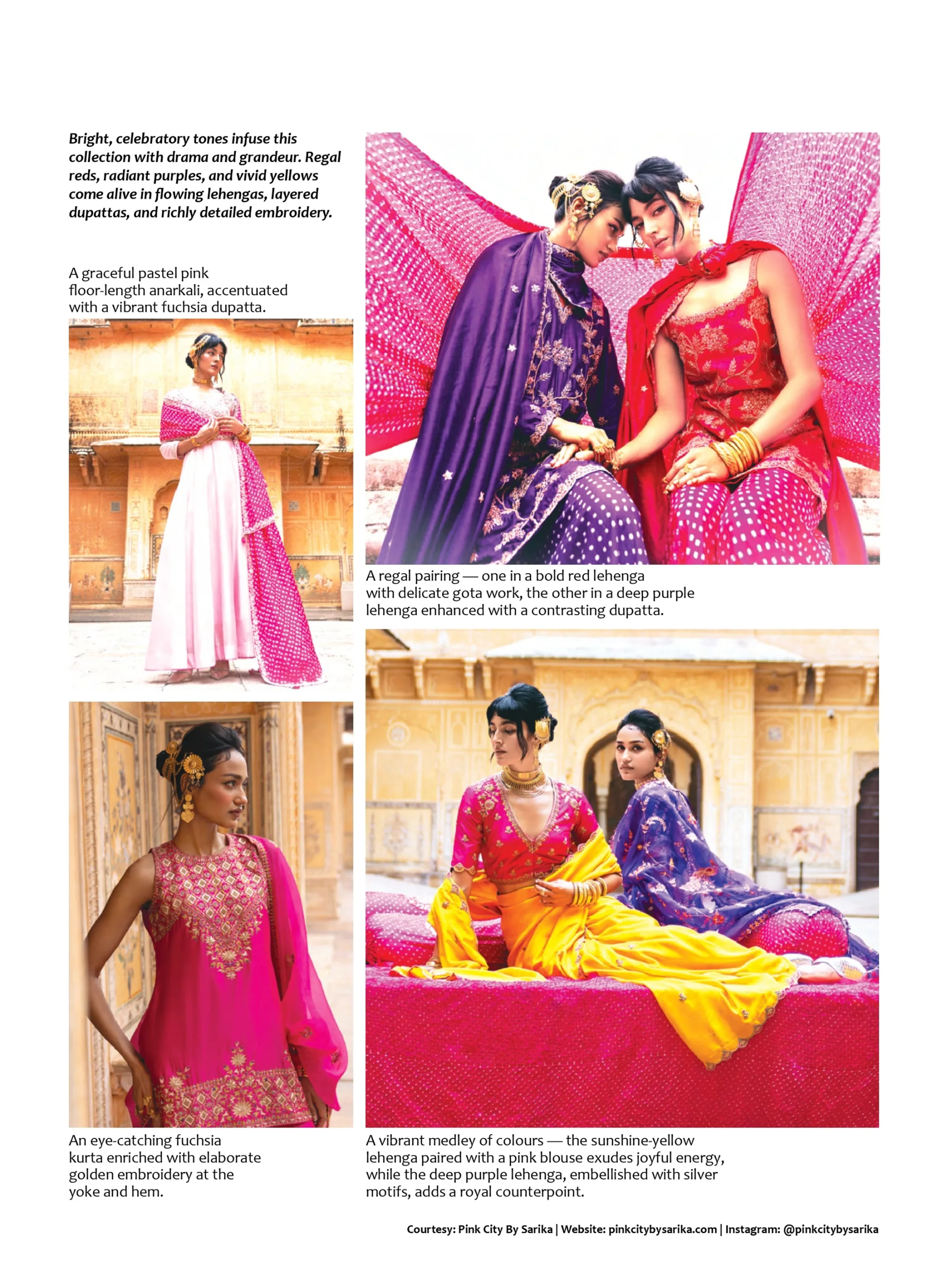 Bright, celebratory tones infuse this collection with drama and grandeur. Regal reds, radiant purples, and vivid yellows come alive in flowing lehengas, layered dupattas, and richly detailed embroidery. Each piece embodies the vibrancy of Rajasthan’s festive spirit, reimagined for today’s woman who celebrates tradition with confidence and colour, making every occasion a canvas of joy.