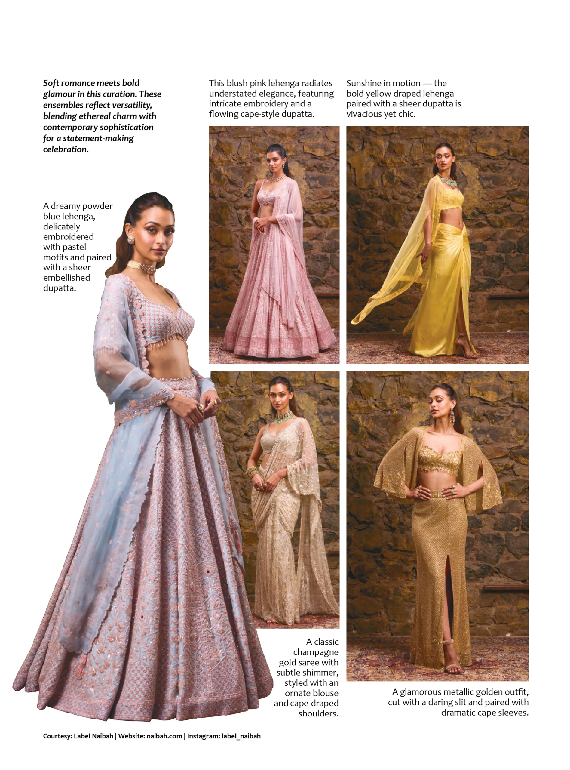 Soft romance meets bold glamour in this curation. Powder blue and blush lehengas whisper elegance, while champagne gold and metallic gowns shimmer with modern drama. Yellow drapes add festive vitality, completing a palette that moves effortlessly from day ceremonies to evening soirees. These ensembles reflect versatility, blending ethereal charm with contemporary sophistication for a statement-making celebration.