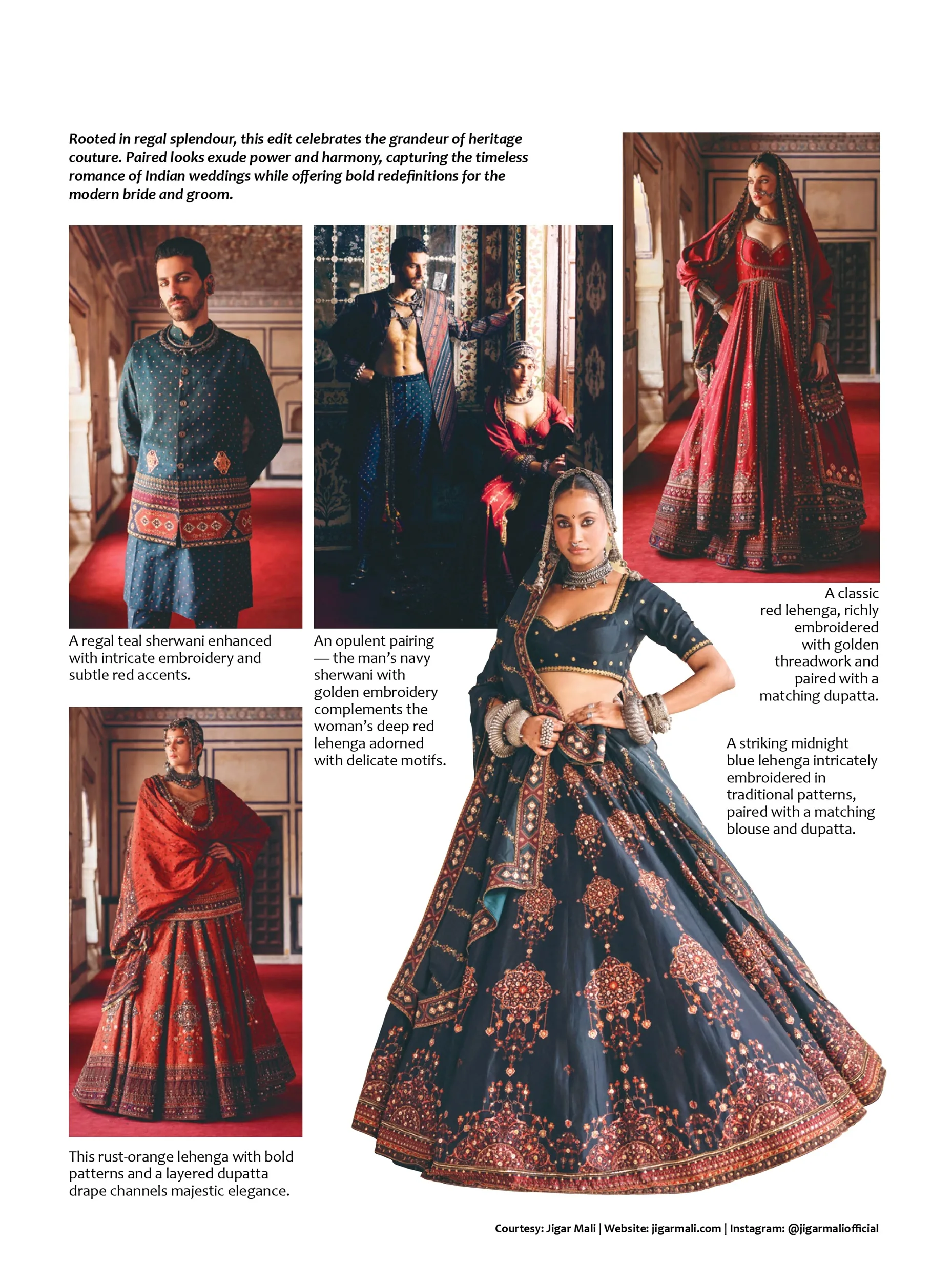 Rooted in regal splendour, this edit celebrates the grandeur of heritage couture. Deep reds, rust oranges, midnight blues, and teal sherwanis radiate opulence through intricate embroidery and rich fabrics. Paired looks exude power and harmony, capturing the timeless romance of Indian weddings while offering bold redefinitions for the modern bride and groom.