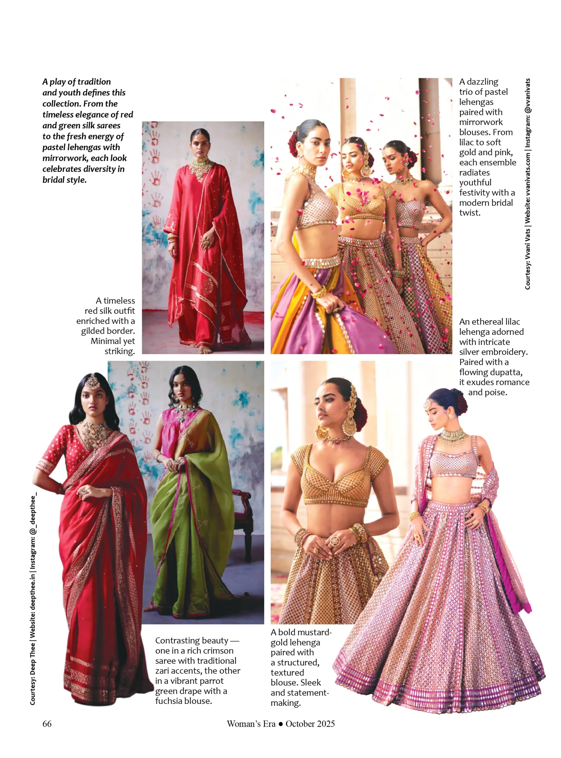 A play of tradition and youth defines this collection. From the timeless elegance of red and green silk sarees to the fresh energy of pastel lehengas with mirrorwork, each look celebrates diversity in bridal style. Mustard golds and lilacs add modernity, creating ensembles that balance heritage with individuality, perfect for women who shine in every celebration.