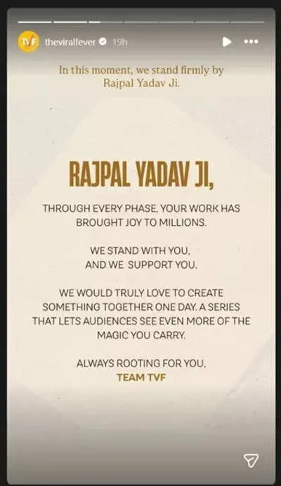 Taking to Instagram Stories, TVF expressed solidarity with Rajpal Yadav and praised his immense contribution to Indian entertainment. The statement read, “We stand firmly with Rajpal Yadav ji during this difficult time. Your work has brought smiles to millions of people over the years. We stand with you and fully support you. We truly hope to create something special with you one day, a series where viewers can witness your magic up close. Team TVF will always pray for you.”