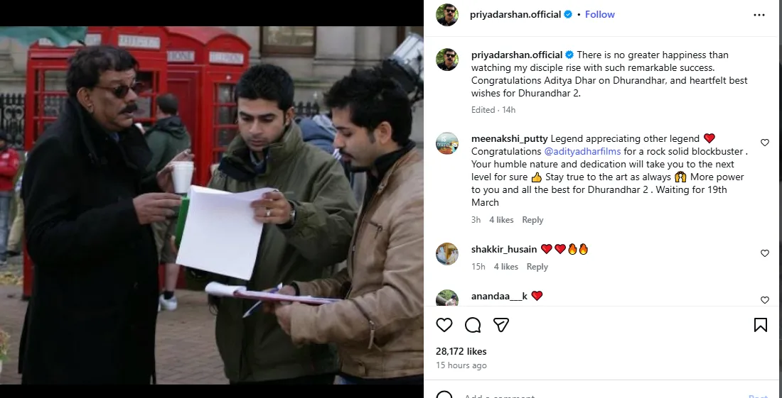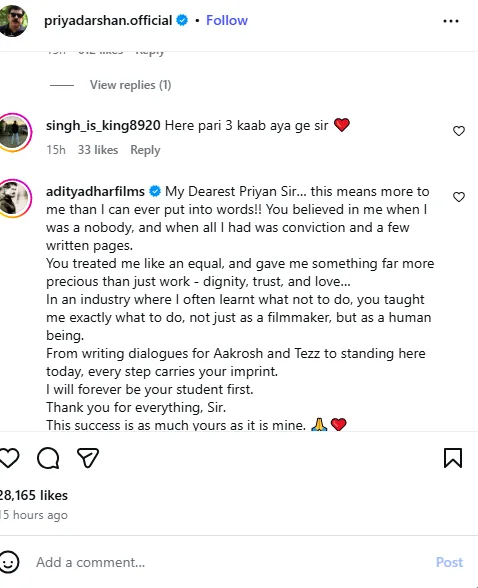 Aditya Dhar also responded to Priyadarshan’s heartfelt message. In the comments, he thanked his mentor for believing in him when he was just starting out — “when I was a nobody, and when all I had was conviction and a few written pages.” Dhar said Priyadarshan gave him more than work — “dignity, trust, and love.”