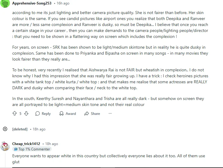 Once the video made its way to Reddit, fans of Deepika used the thread to push back hard against Rathee’s claims. Many argue that changes in appearance are often down to factors like lighting, camera quality, makeup, skincare routines, or simply natural shifts in tone over time. Some pointed out that in earlier days, Deepika tended to have a slightly darker tan — a common trend in the 2000s — rather than being significantly darker.